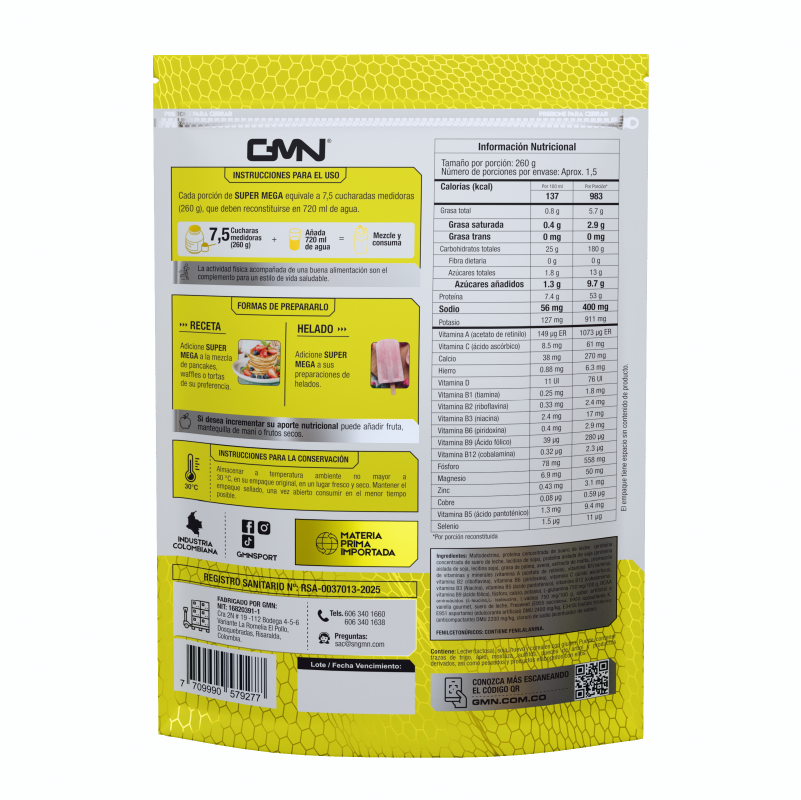 Preparación: Cada porción de SUPER MEGA equivale a 7,5 cucharadas medidoras (260 g), que deben reconstruirse en 720 ml de agua.