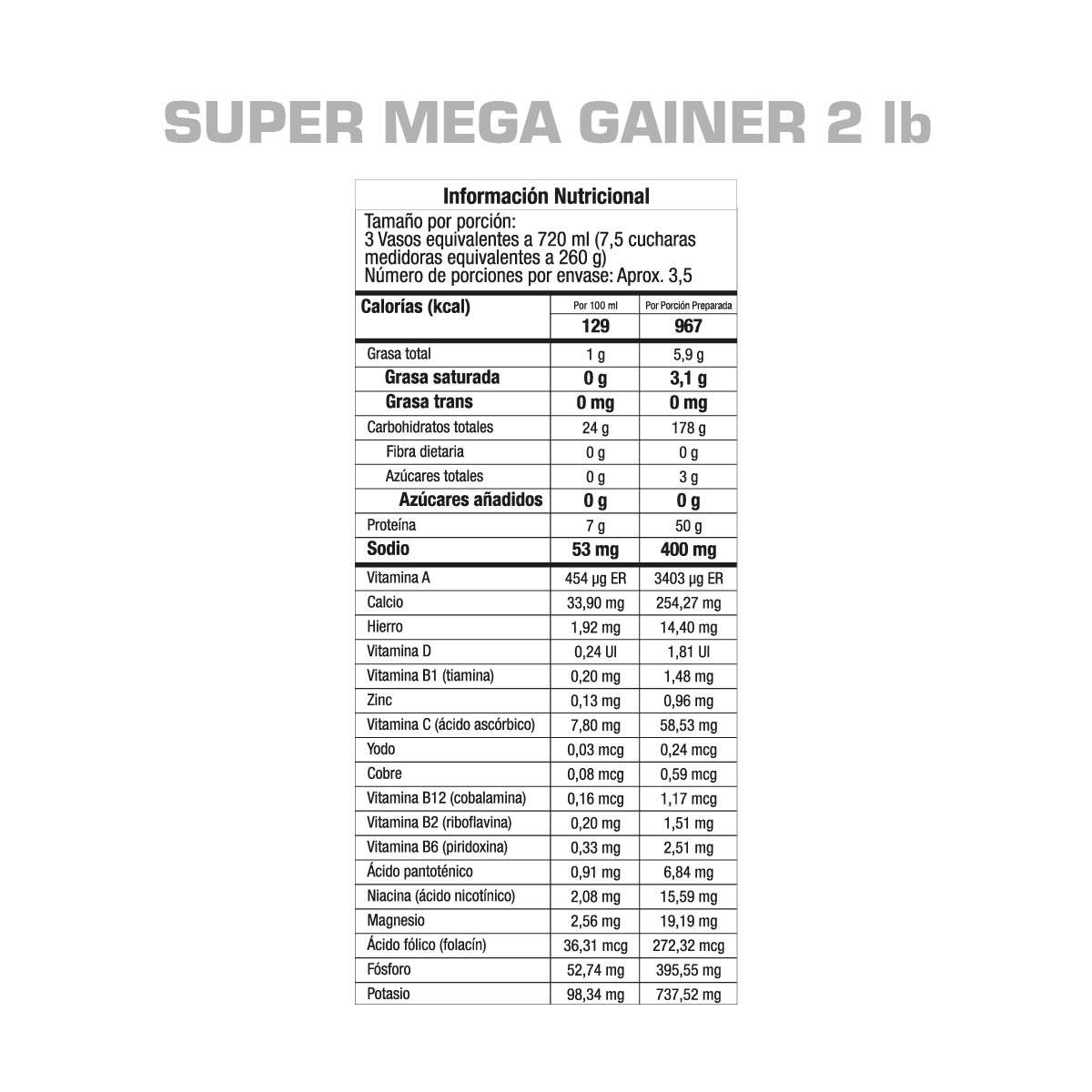 Cada porción de SUPER MEGA GAINER equivale a 7,5 cucharadas medidoras (260 g), que se recomienda diluir en 3 vasos con agua (750 ml). Se sugiere dividir la porción en 3 tomas, diluyendo 2,5 cucharas medidoras del producto (87 g) en 1 vaso de agua (240 ml) y consumir una vez preparado.